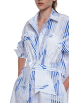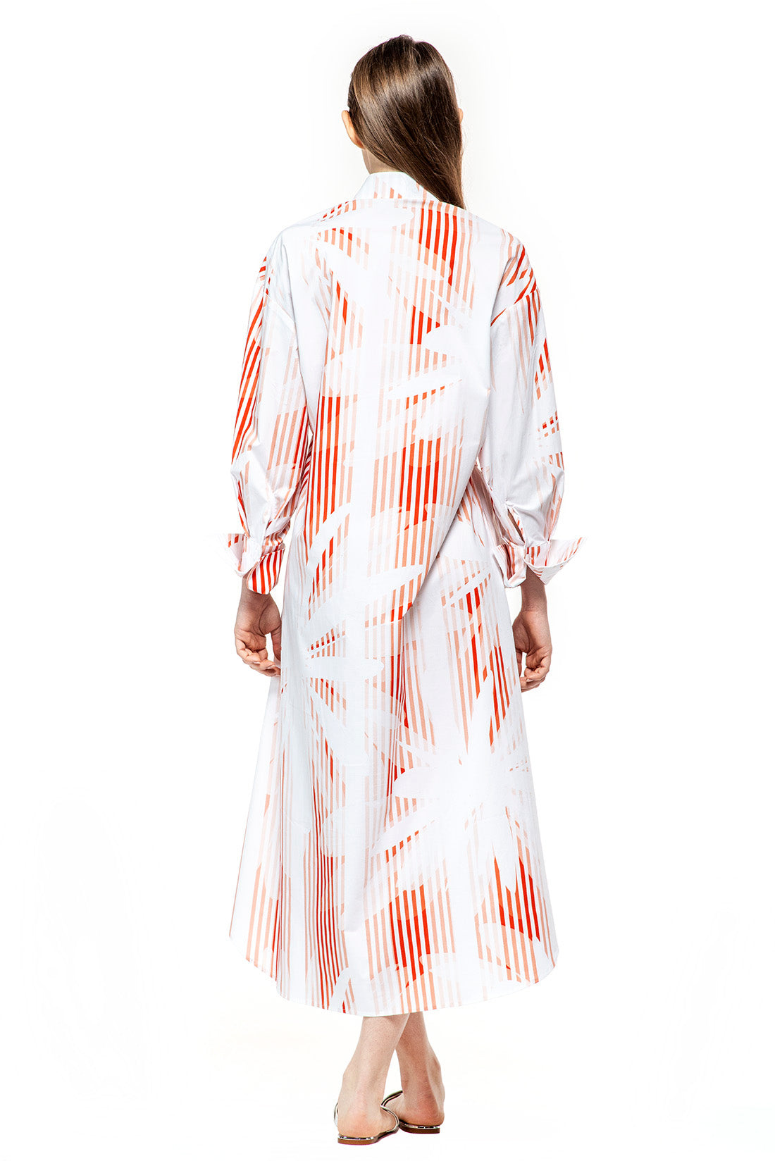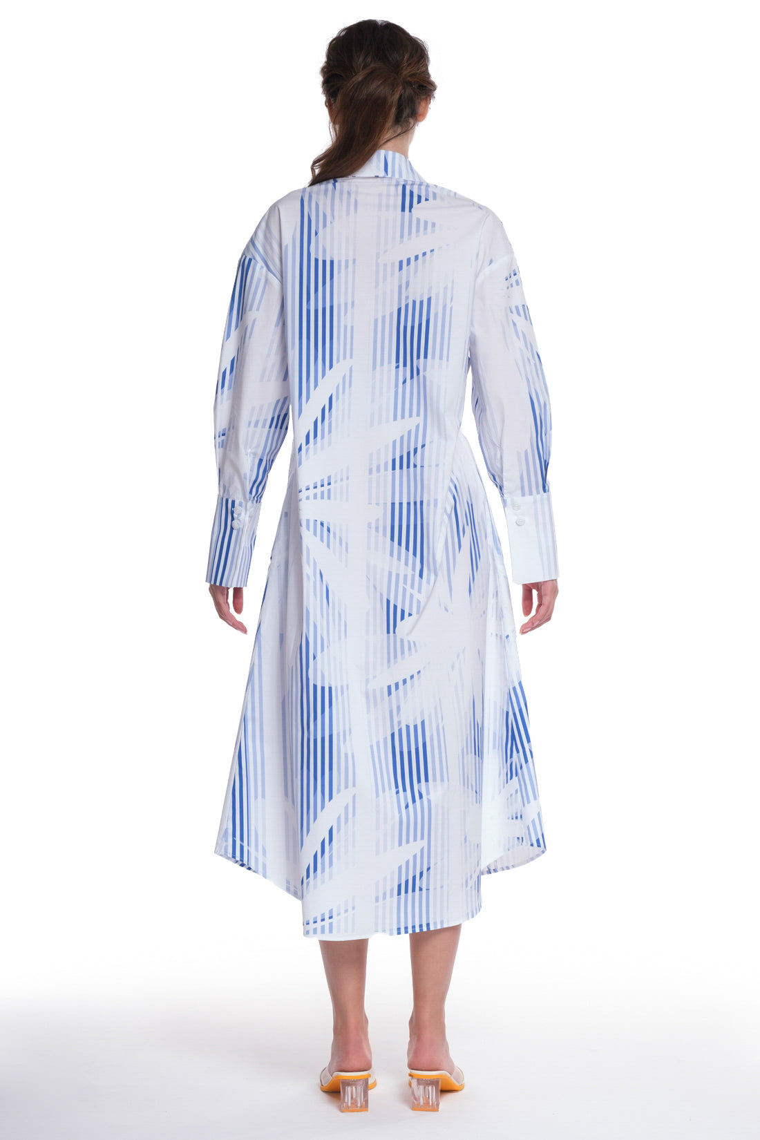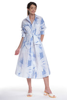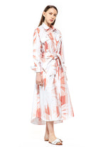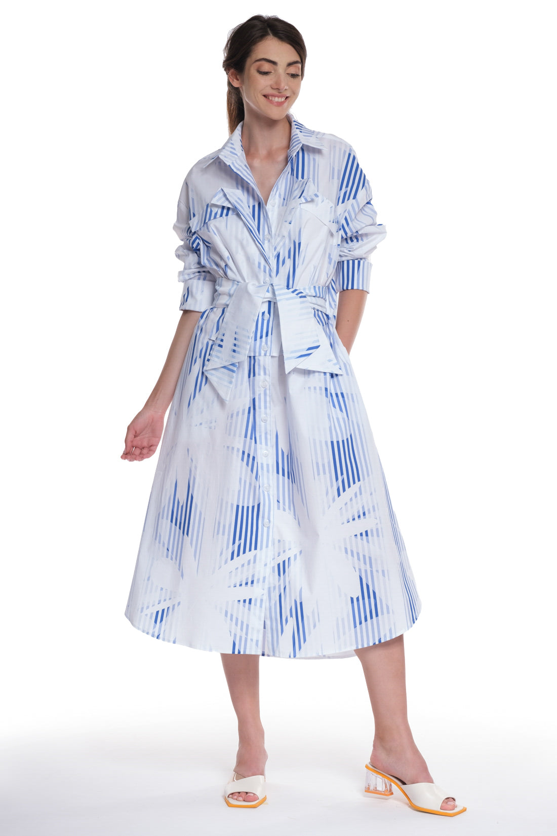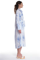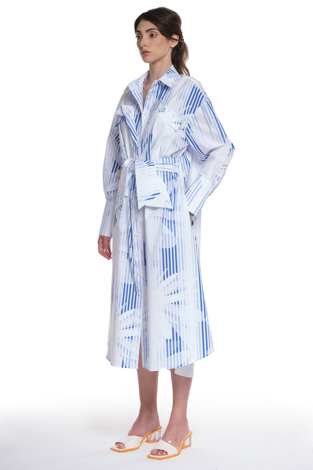 Long print stretch cotton dress with long sleeves and bow application, the belt can be tied at either the front or from behind. Two side pockets.