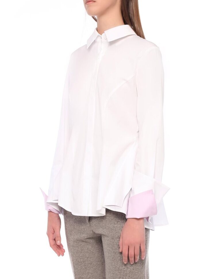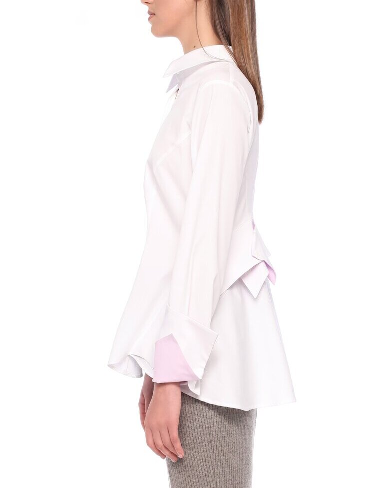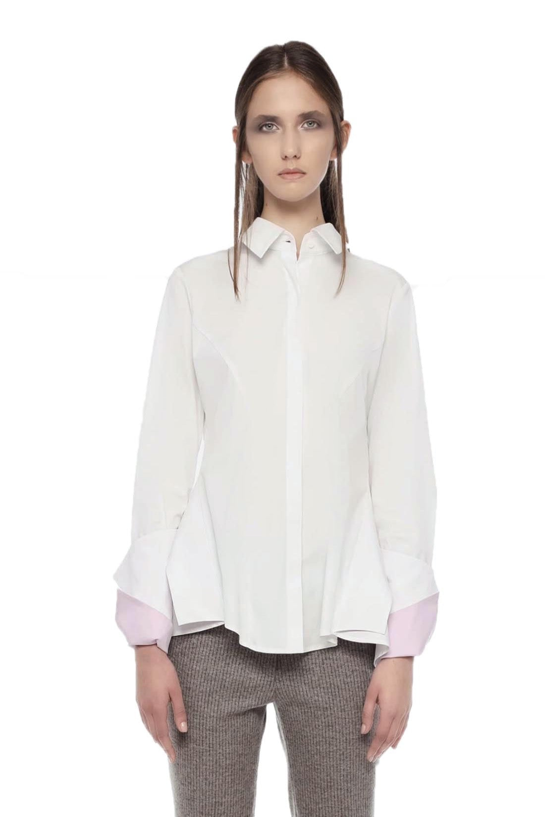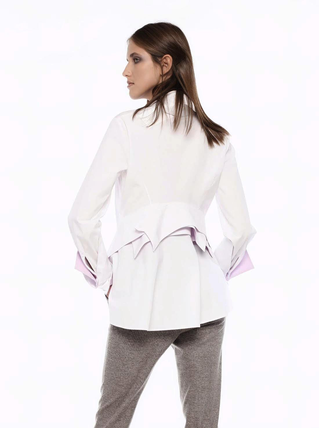 Stretch cotton poplin shirt, with long sleeves, hidden central buttoning, overlapping collars that form the detail on the back, fancy cuffs.