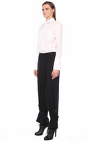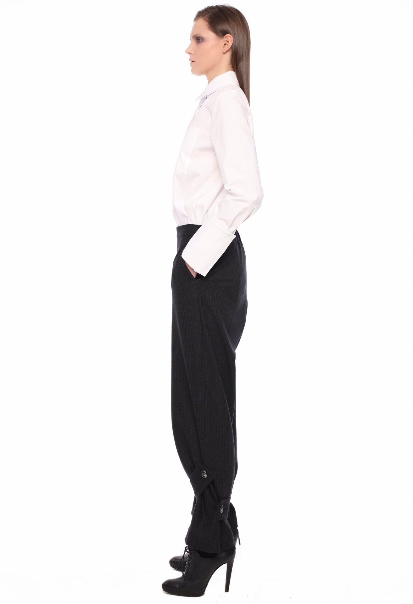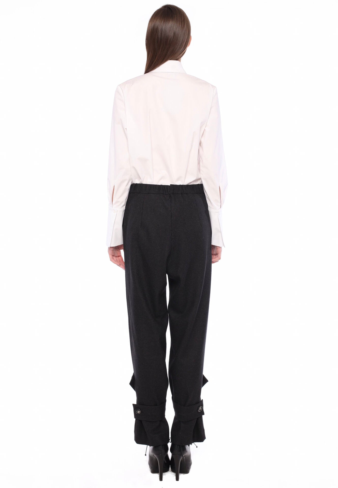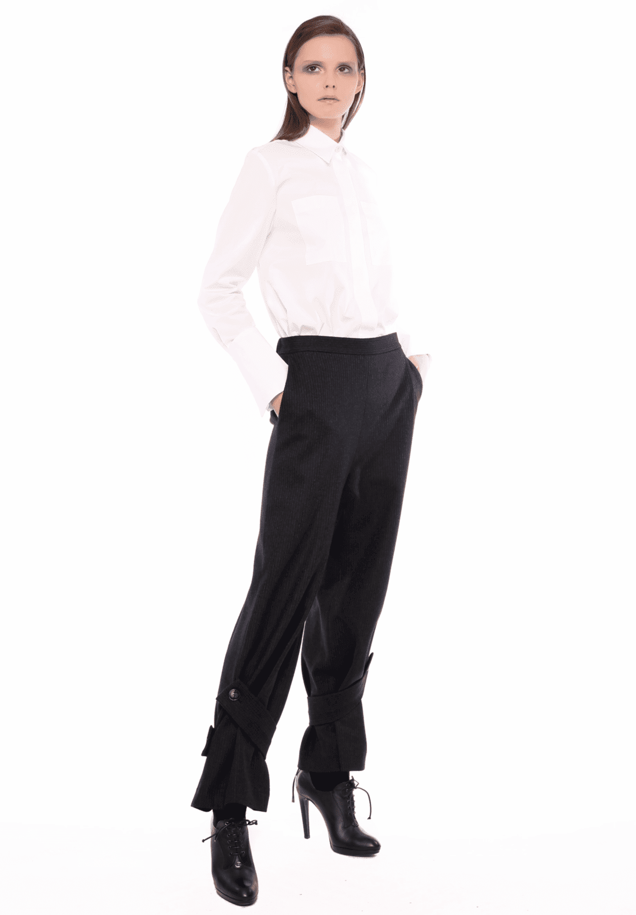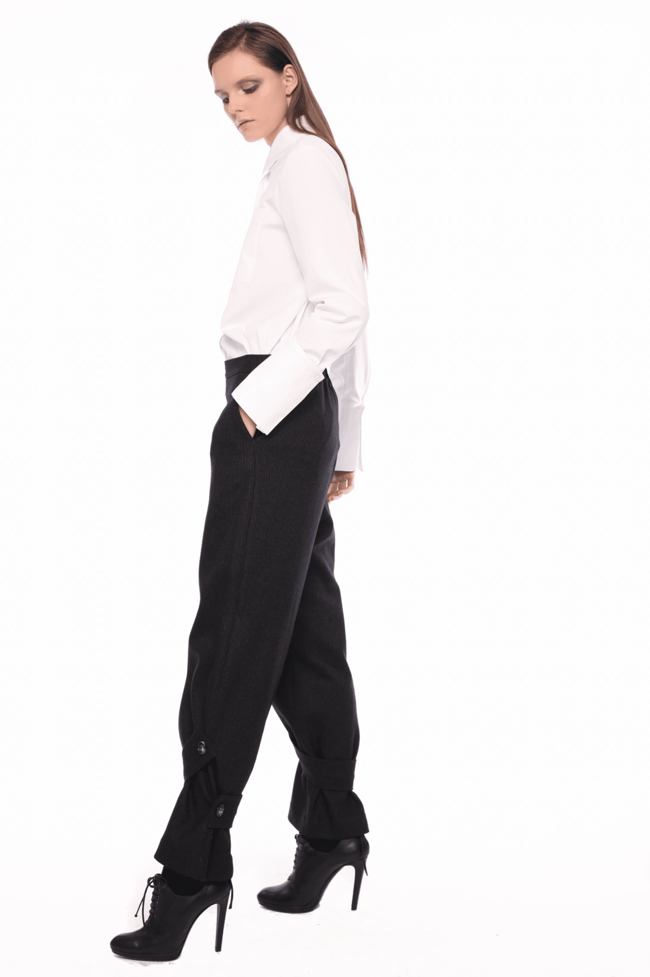 Elegant pants, comfortable fit, featuring adjustable cuffs fastened with a button at ankle height.