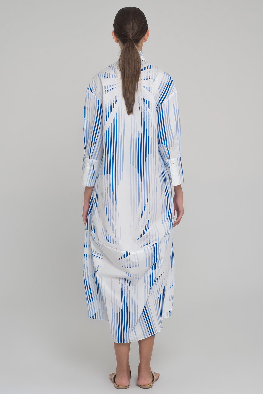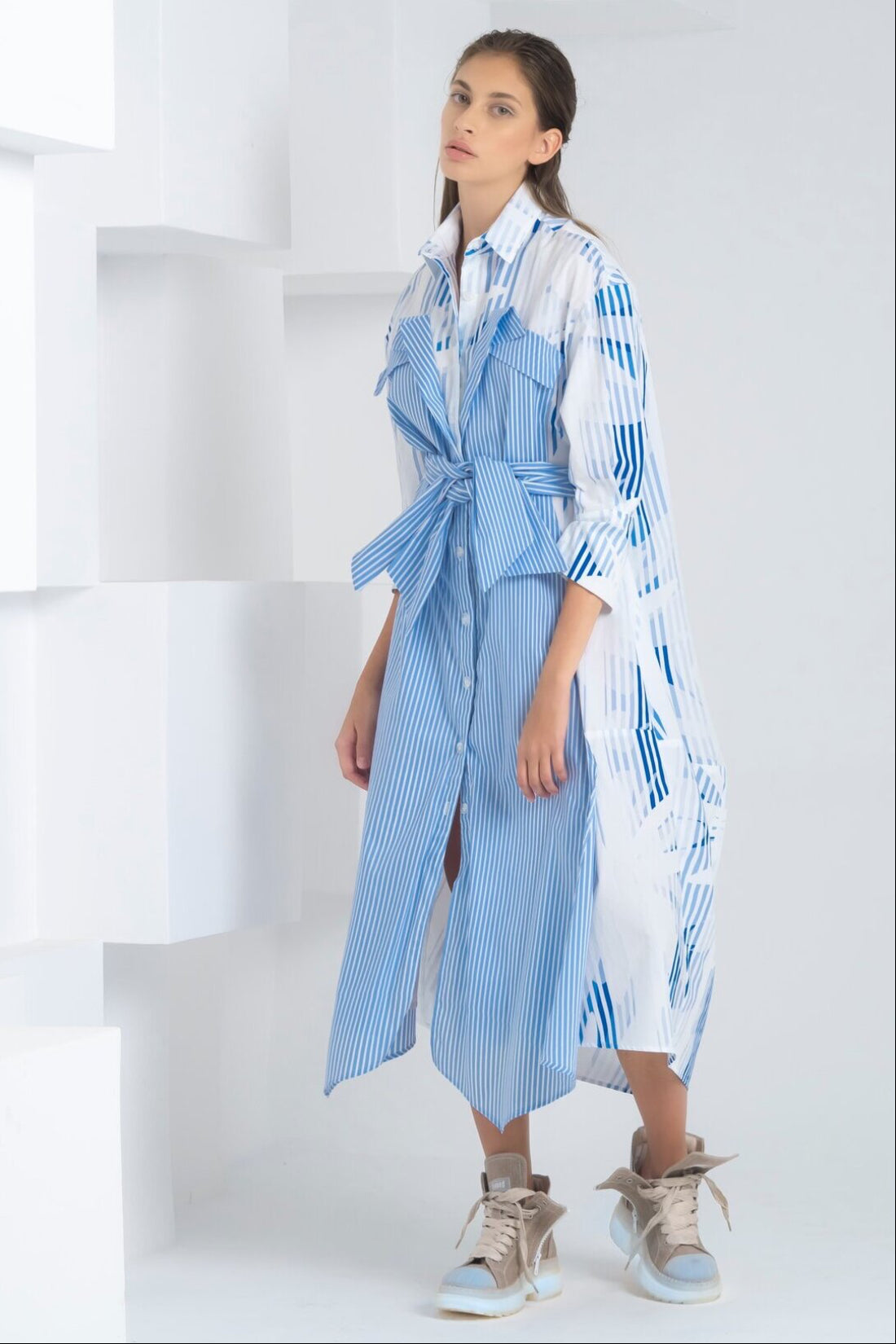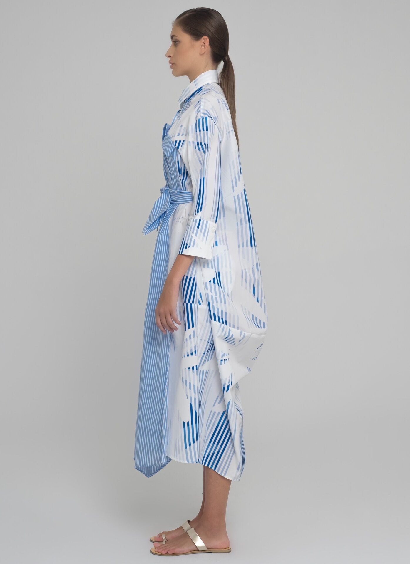 LONG COTTON POPLIN DRESS WITH LONG SLEEVES AND BOW APPLICATION IN CONTRASTING FABRICS. THE BELT CAN BE TIED AT THE EITHER THE FRONT OR BACK SIDES.