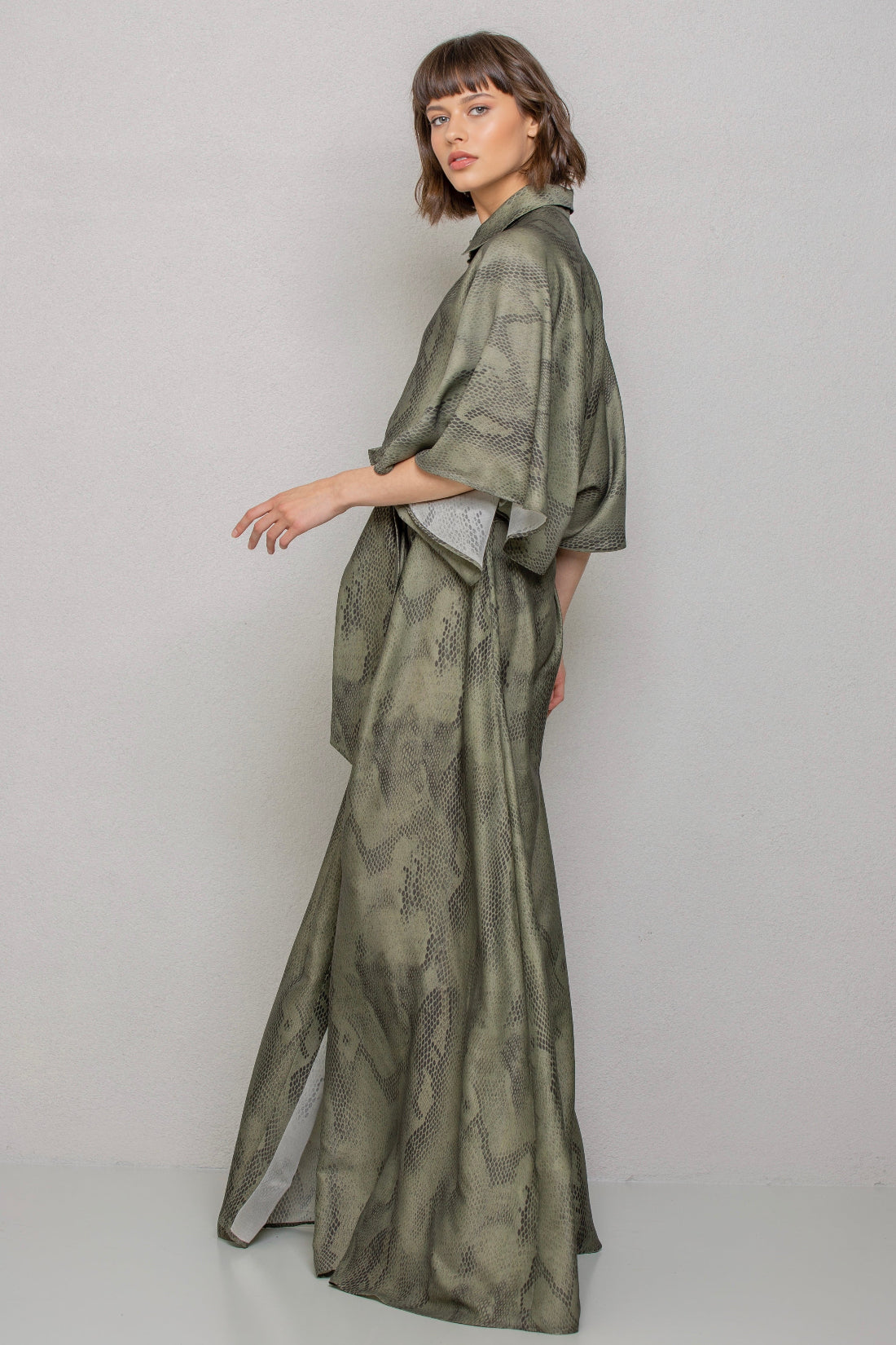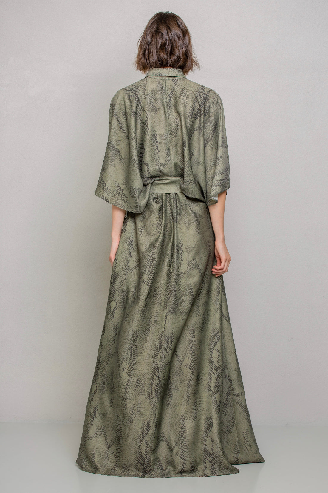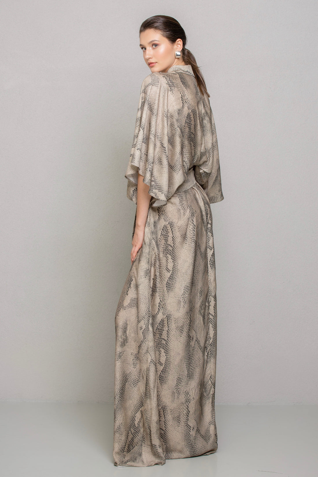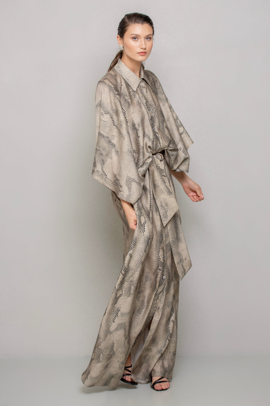 Long soft-touch kimono-style dress made from python-pattern printed fabric. This design features a collar, a full-length front button closure, and wide batwing sleeves that reach mid-arm, two sides pockets.