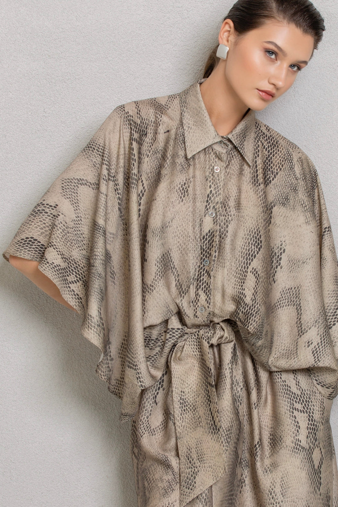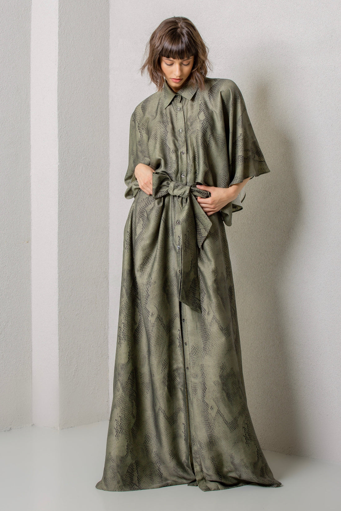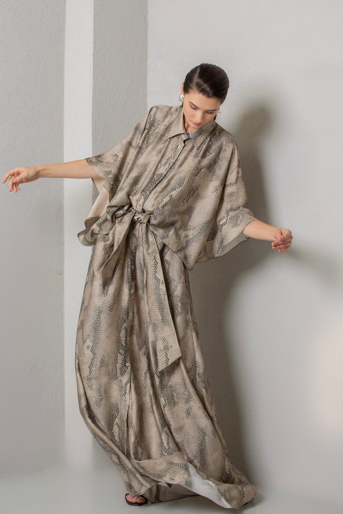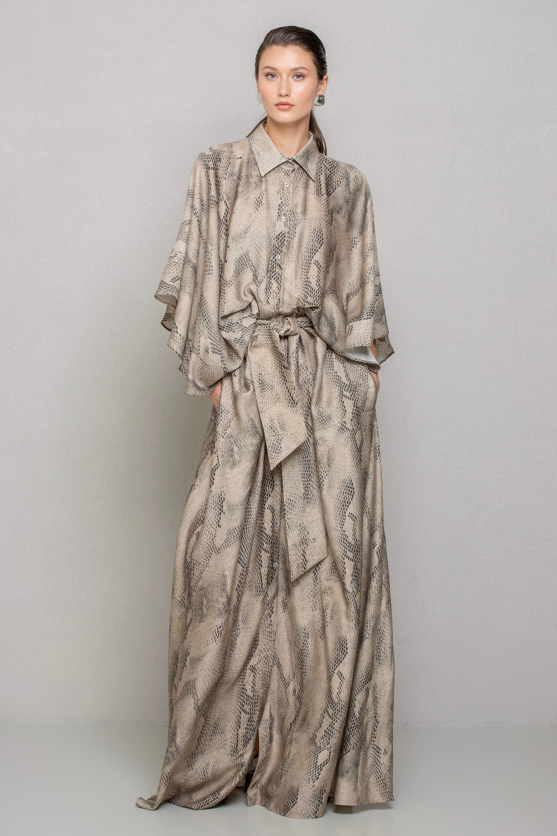 Long soft-touch kimono-style dress made from python-pattern printed fabric. This design features a collar, a full-length front button closure, and wide batwing sleeves that reach mid-arm, two sides pockets.