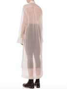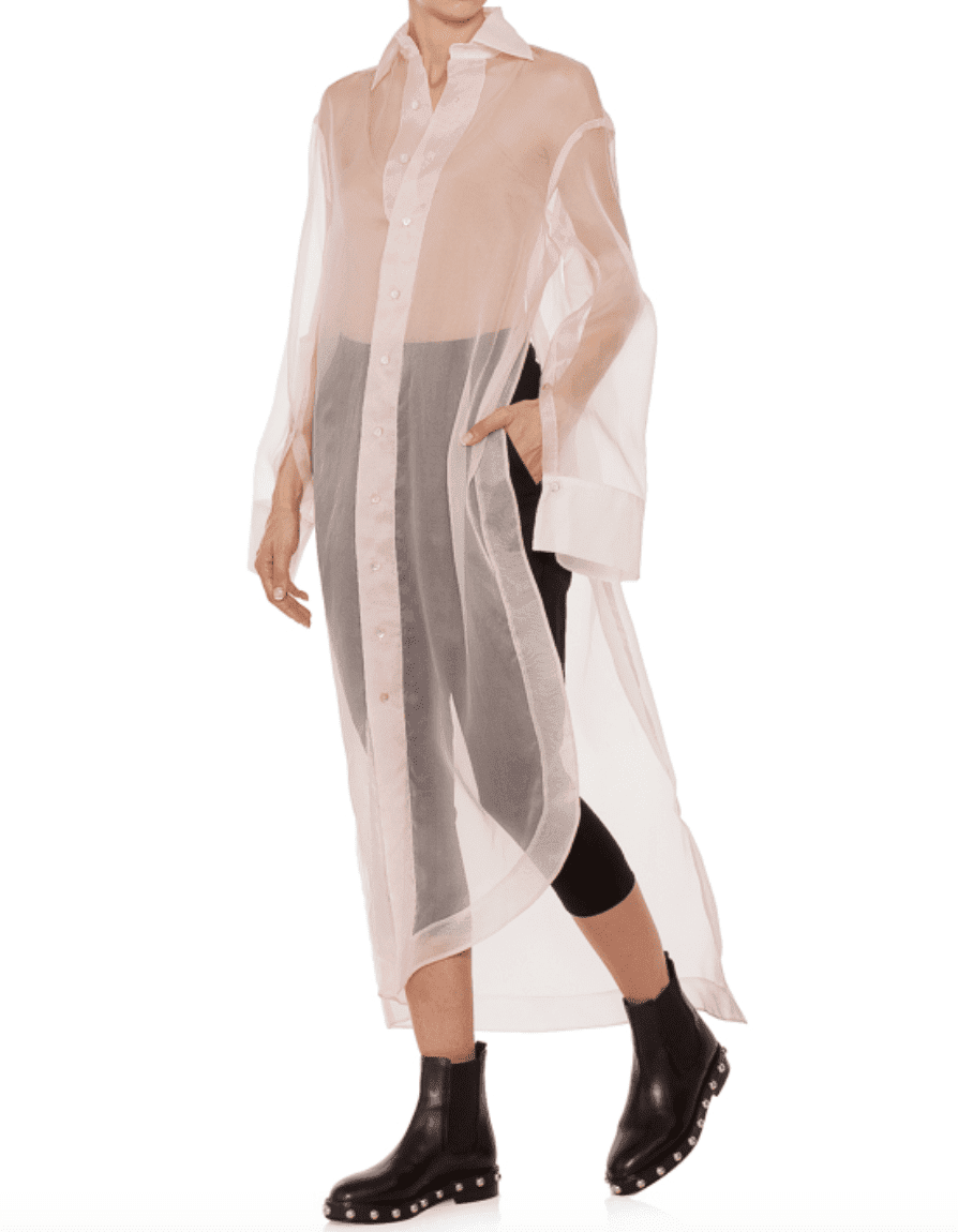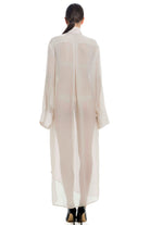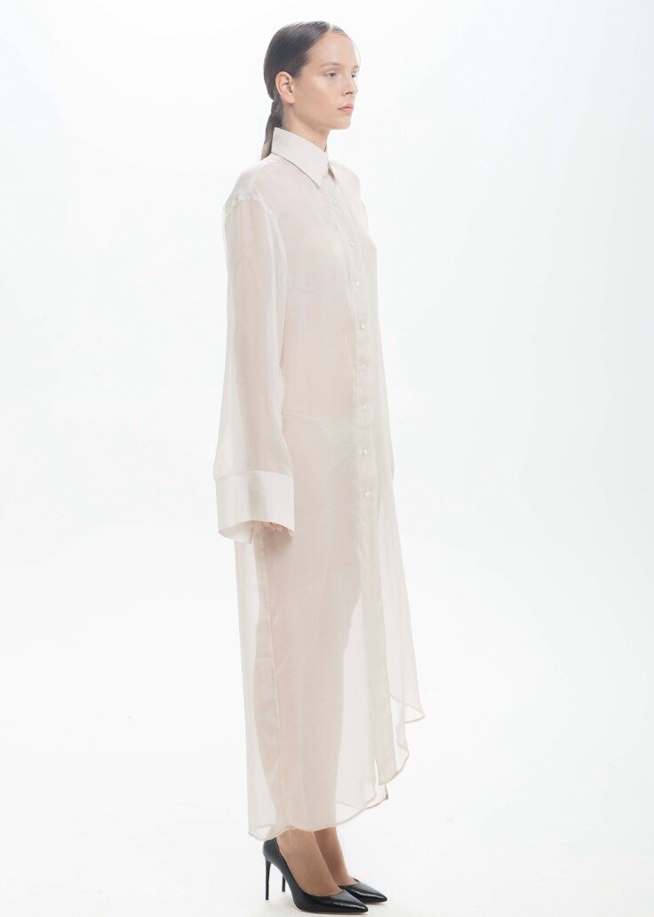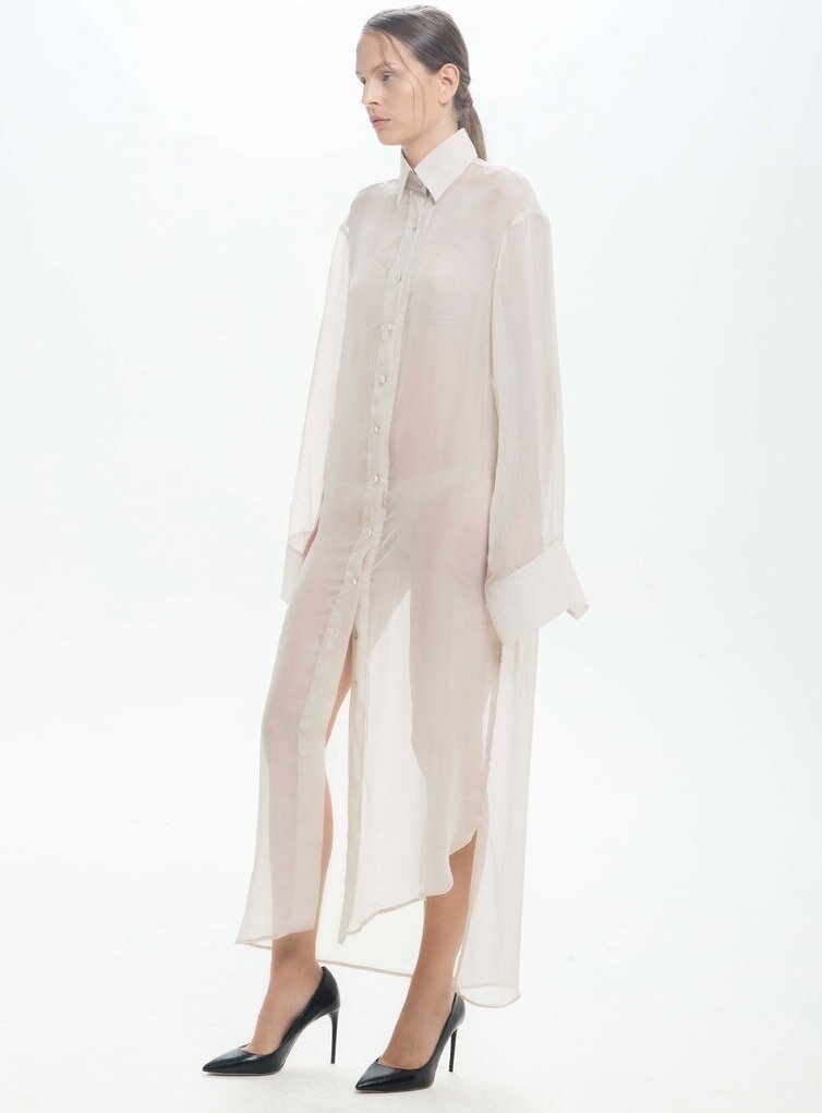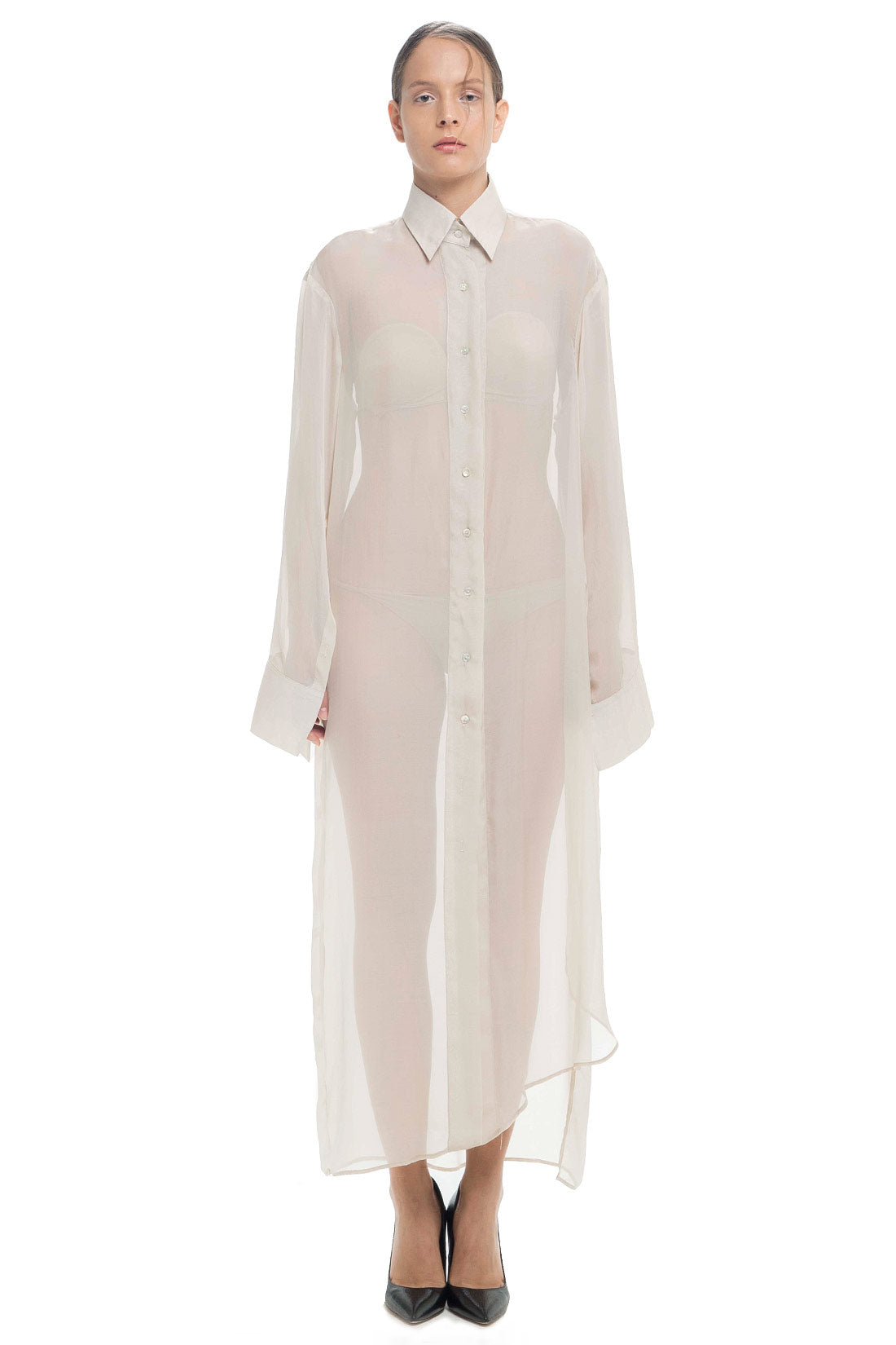 LONG SHIRT WITH EXTENSIVE SIDE VENT, DESIGNED TO BE WORN WITH A SKIRT AS WELL AS WITH A TOP AND PANTS TO FORM YOUR USUAL OUTFIT. MADE OF SILK ORGANZA WITH MOTHER-OF-PEARL BUTTONS.