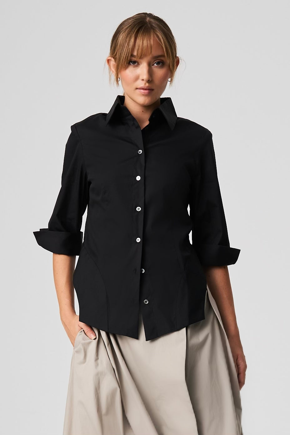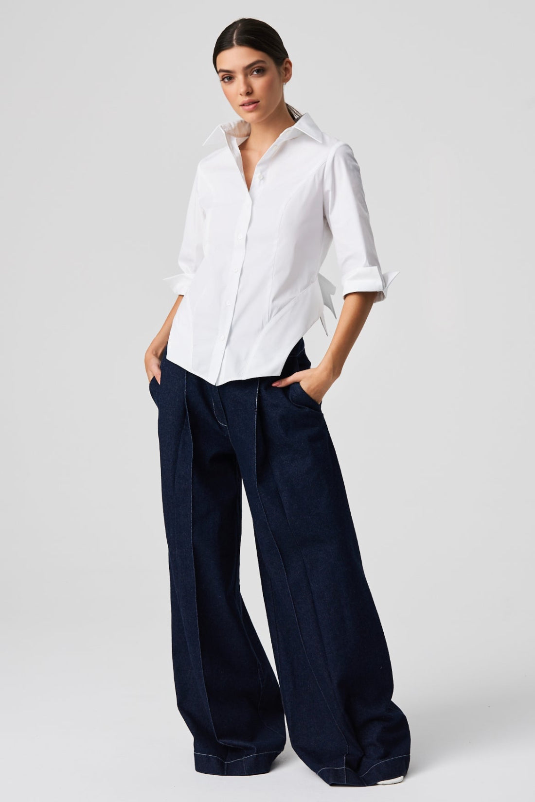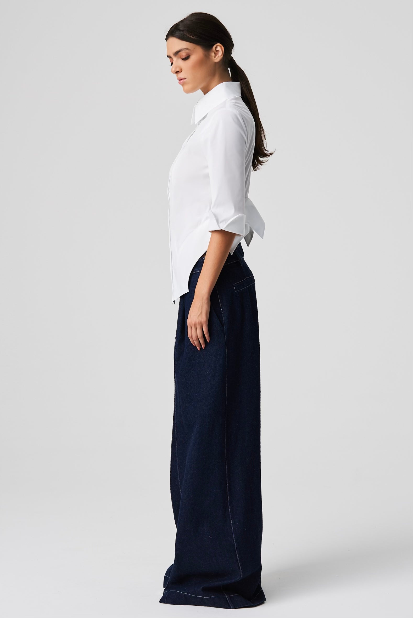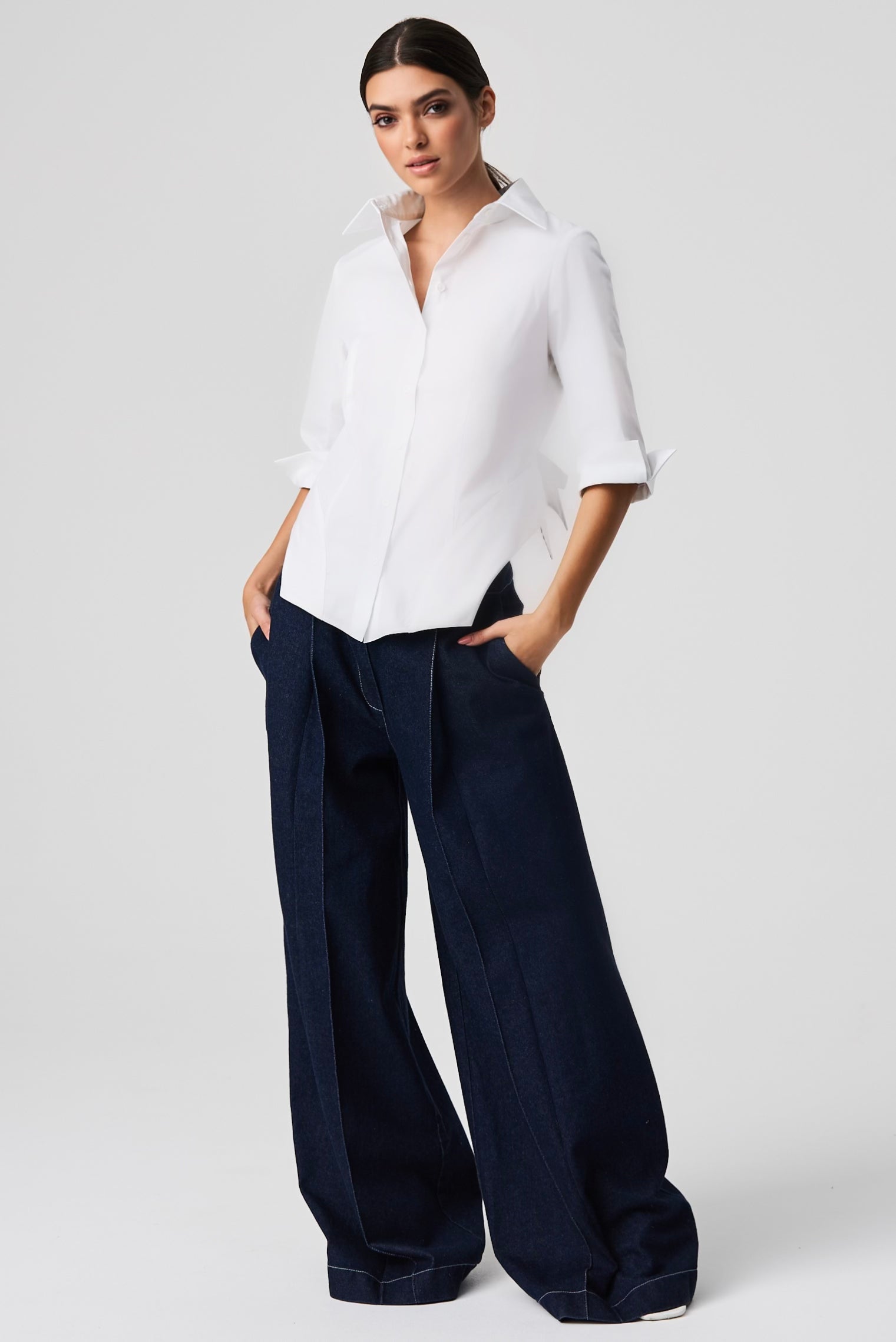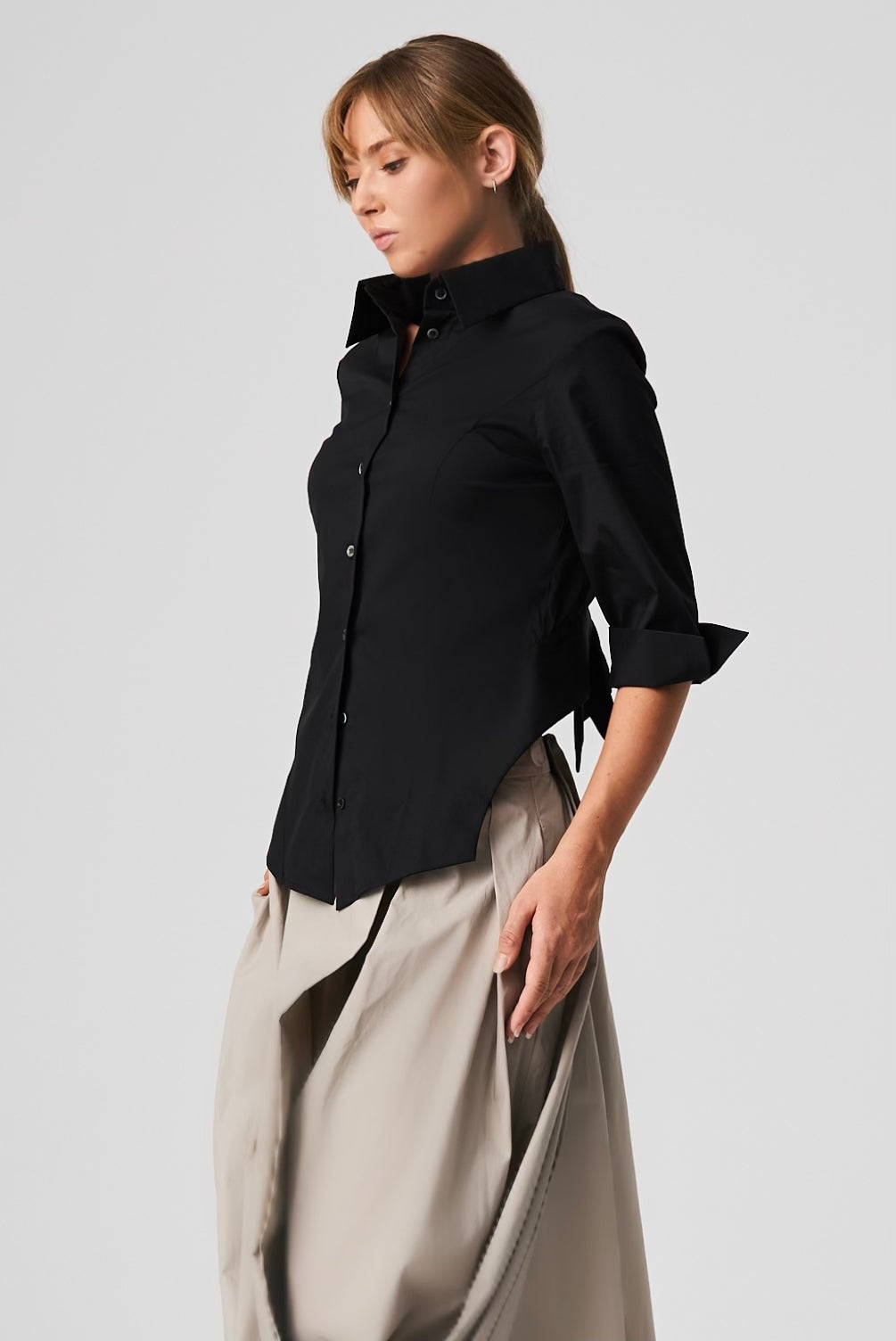 Slim-fit shirt with three-quarter sleeves, foldable cuffs, and a regular collar. The unique feature of this design is the back: the length reaches the waistline, and the hem is decorated with a double decorative collar, while the front has a clean look with an angled hem.
