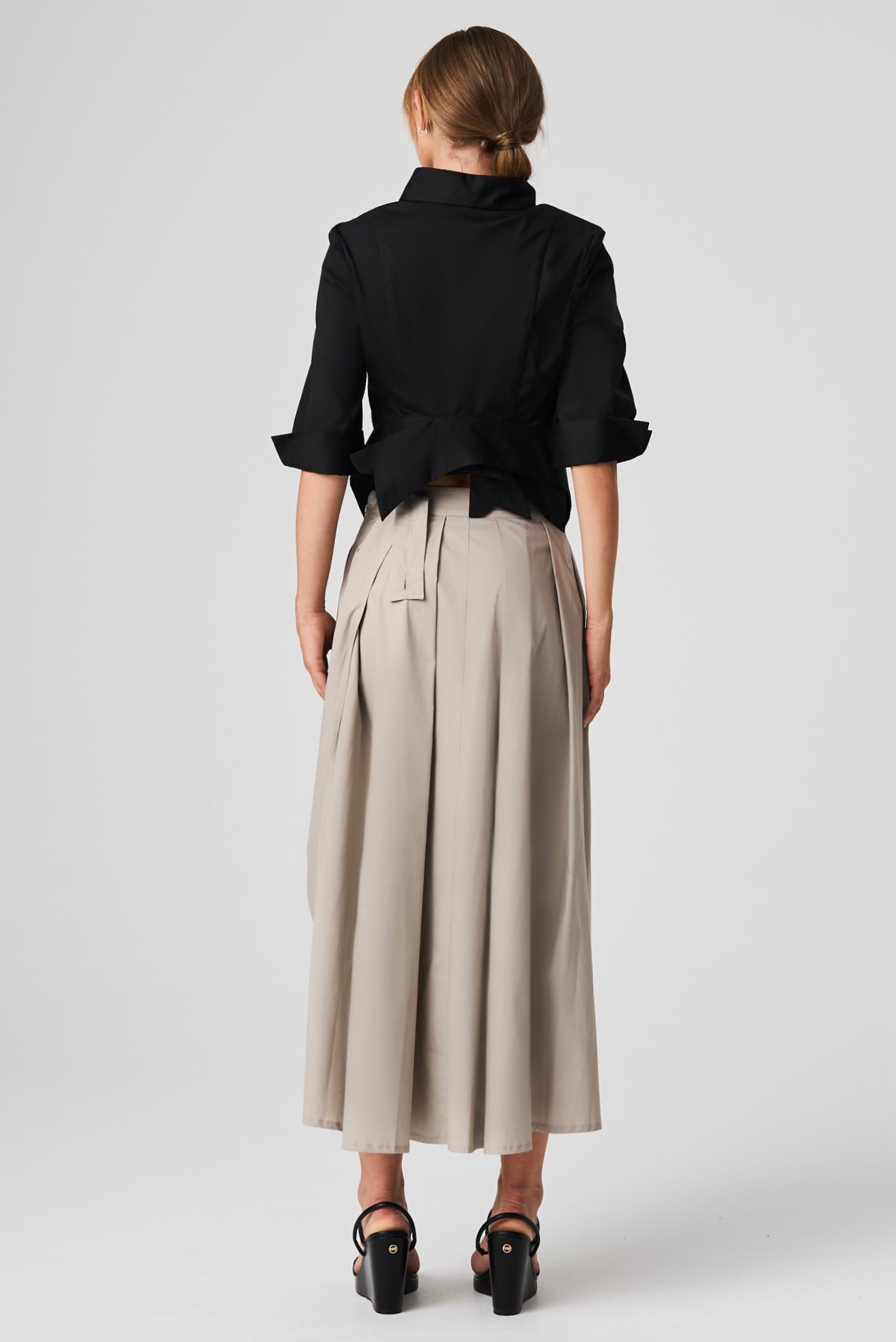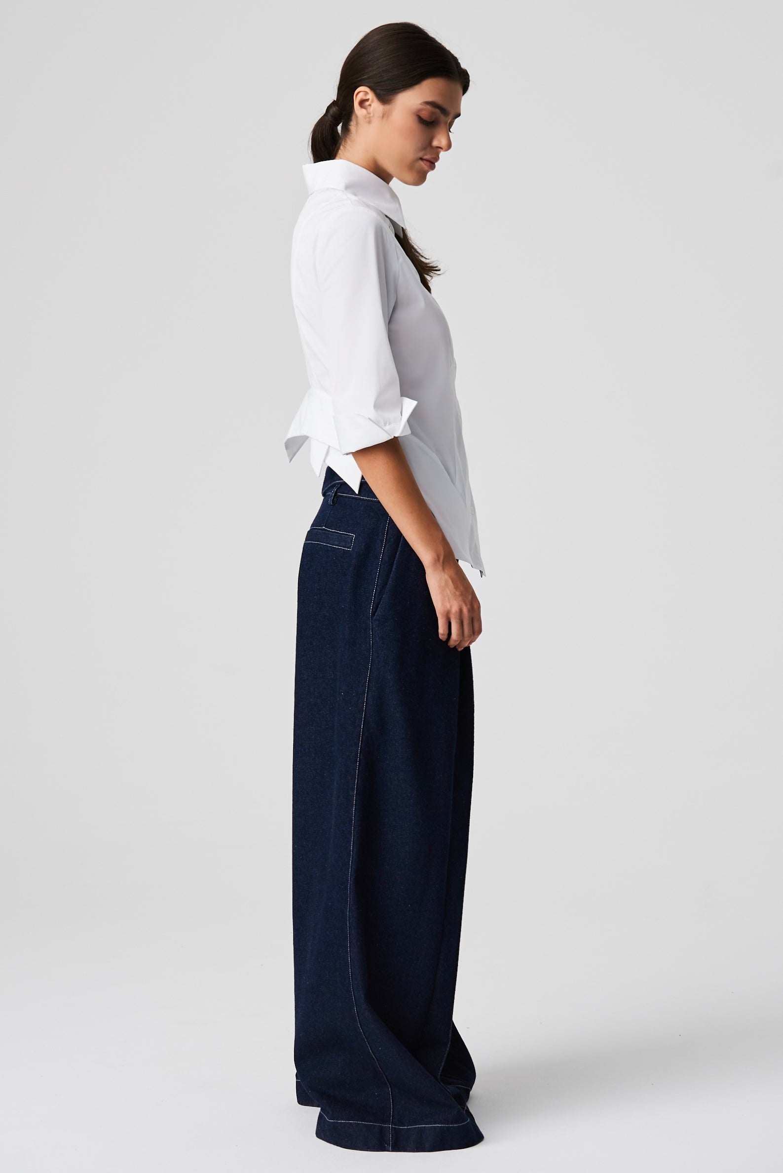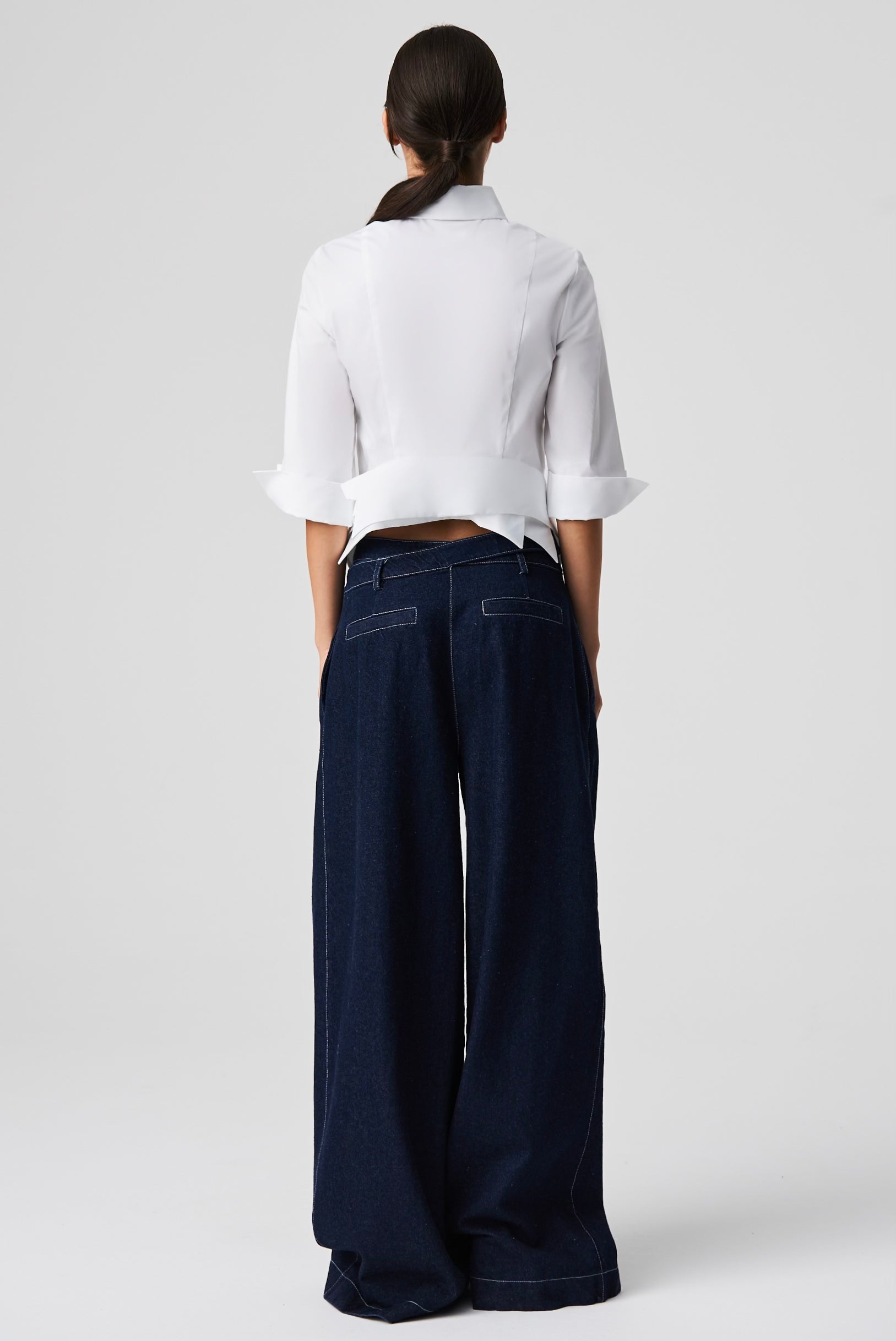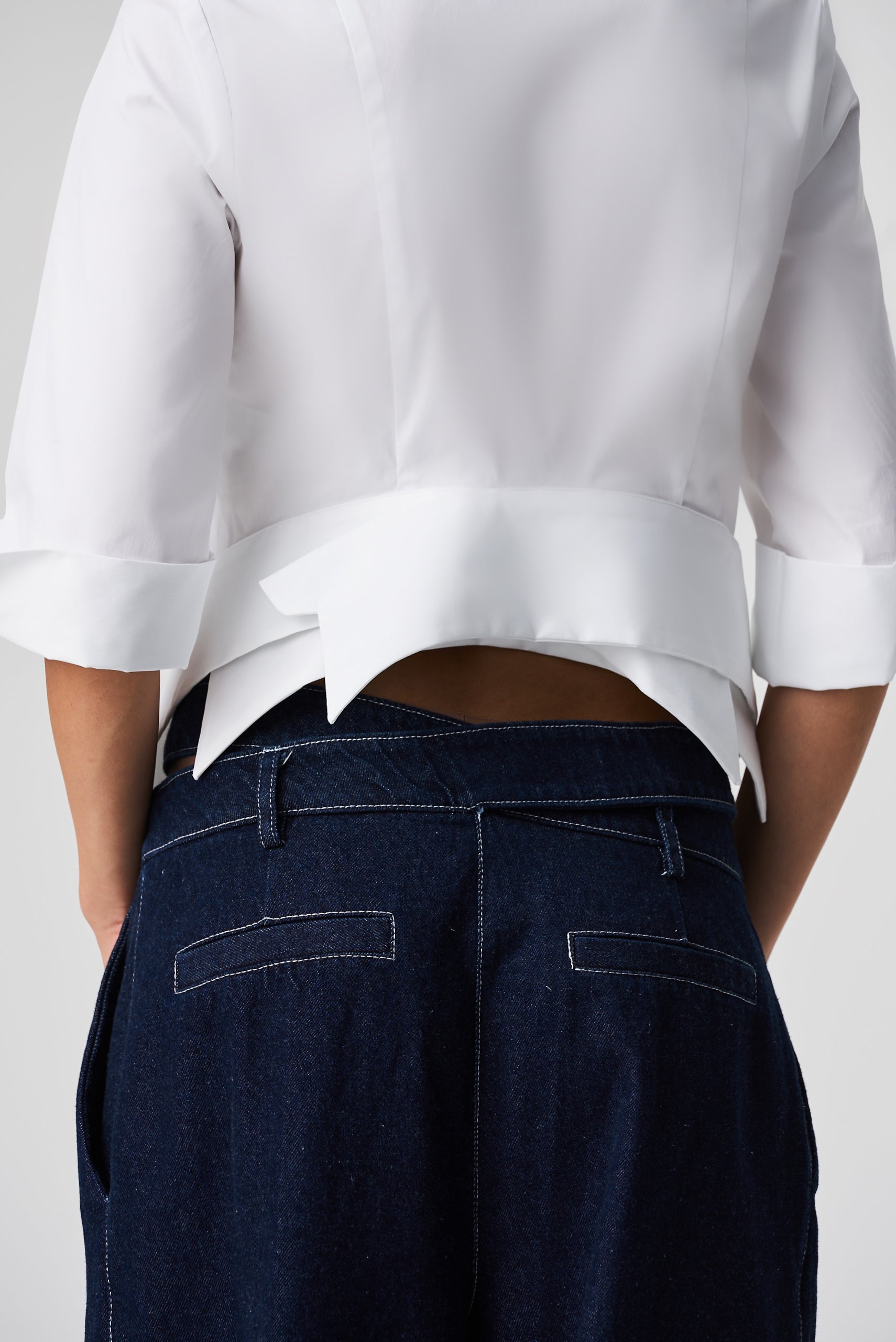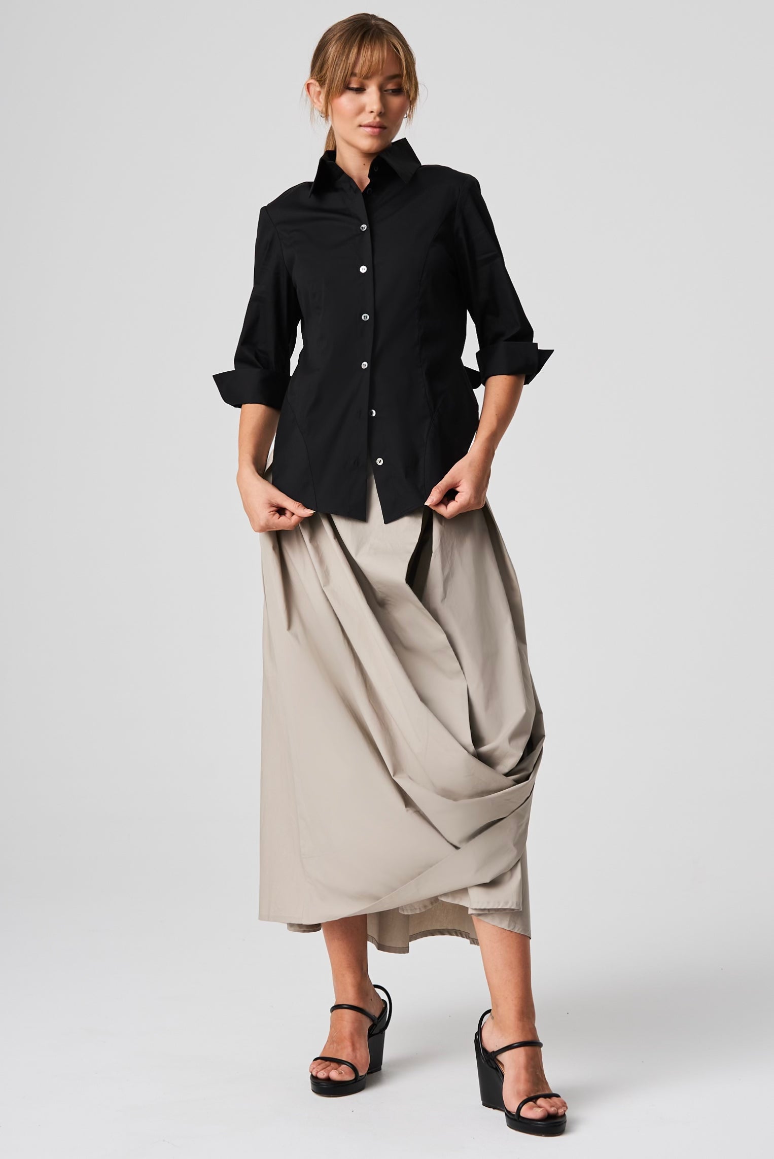 Slim-fit shirt with three-quarter sleeves, foldable cuffs, and a regular collar. The unique feature of this design is the back: the length reaches the waistline, and the hem is decorated with a double decorative collar, while the front has a clean look with an angled hem.