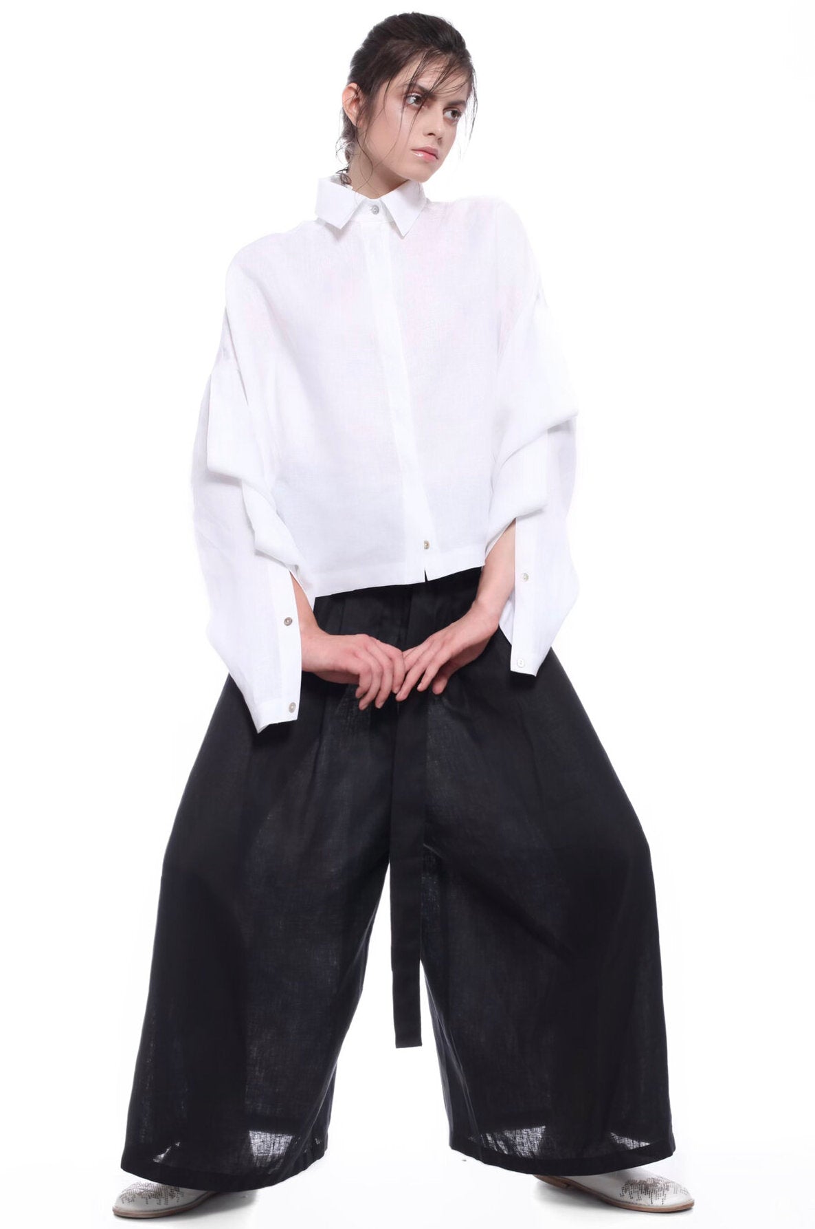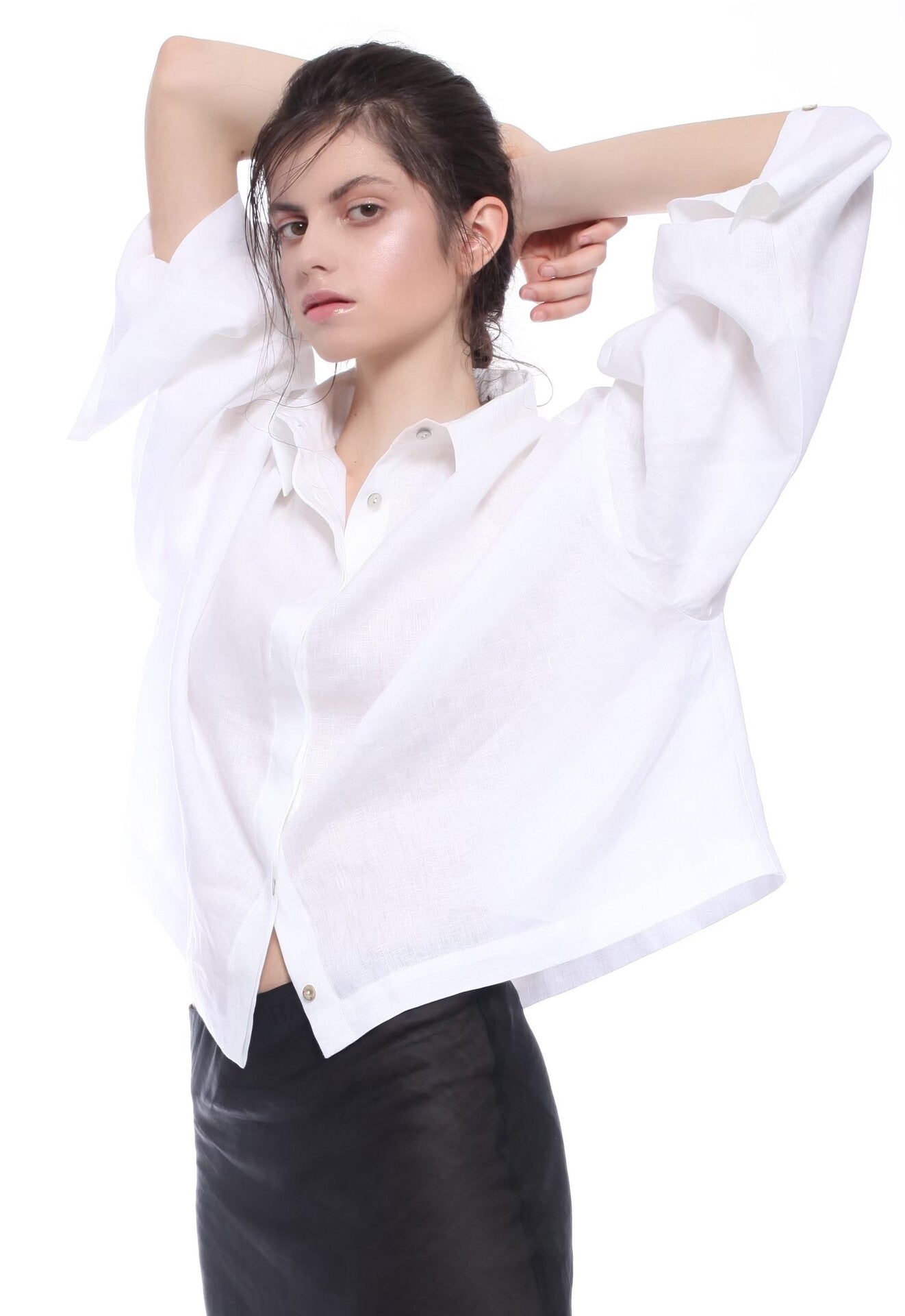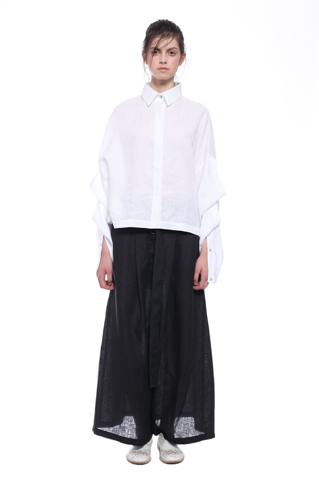 OVERSIZE SHIRT MADE OF ORGANIC LINEN AND COTTON, ADJUSTABLE MOTHER-OF-PEARL BUTTON OPENING ALONG THE SLEEVES, GIVING THE POSSIBILITY TO BUTTON IN DIFFERENT WAYS.
