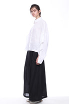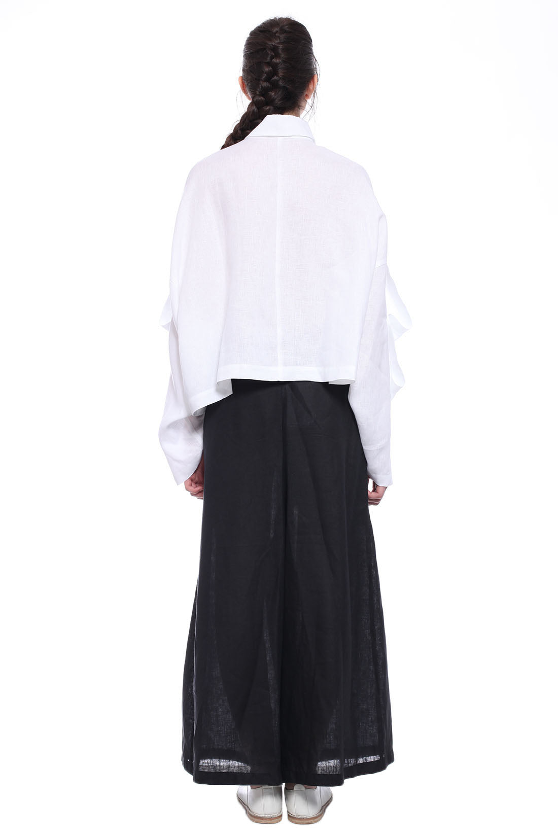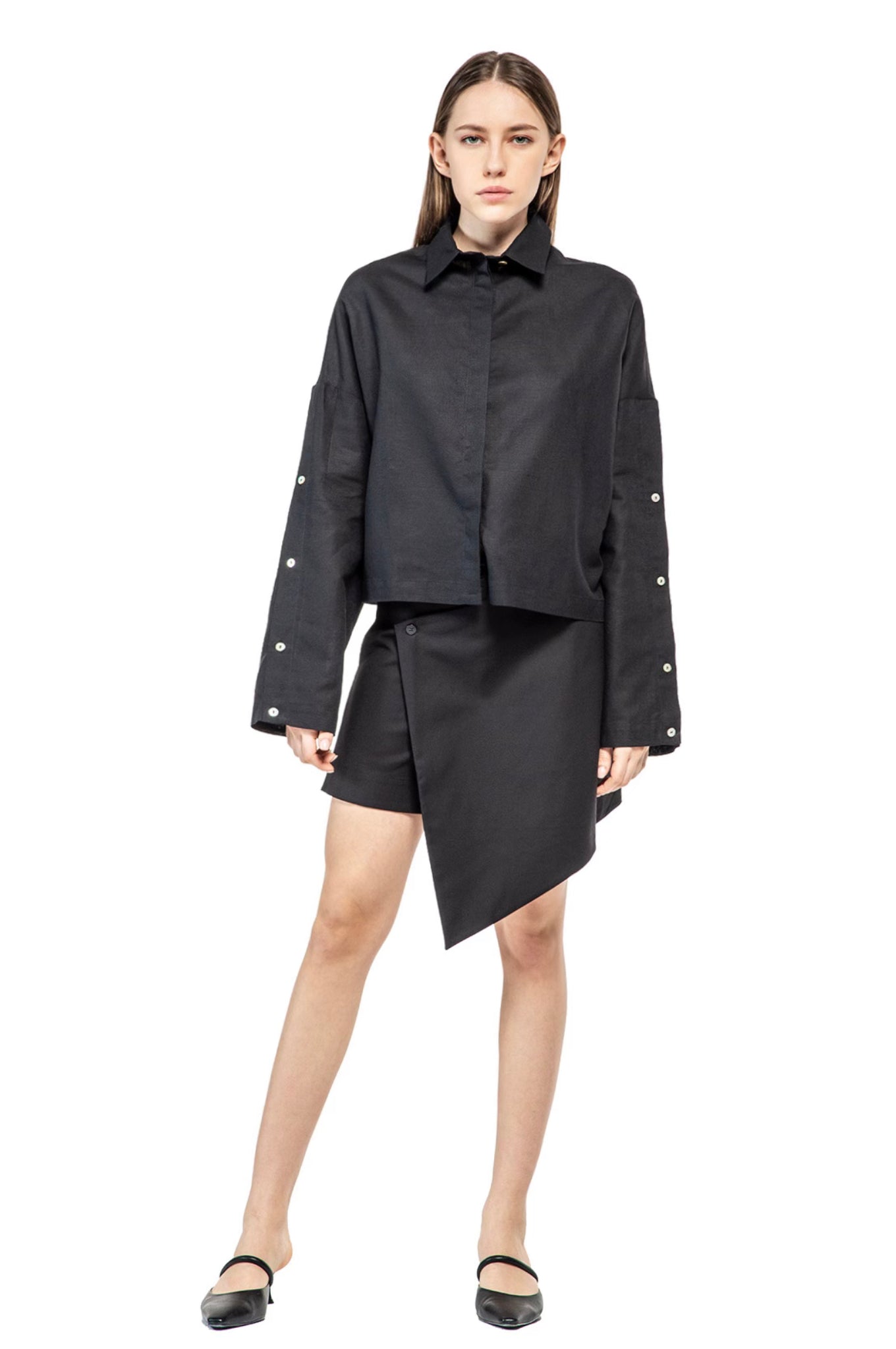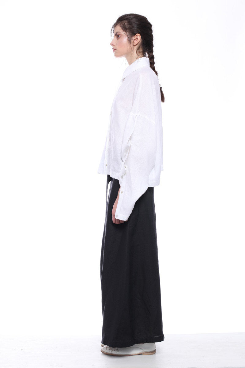 OVERSIZE SHIRT MADE OF ORGANIC LINEN AND COTTON, ADJUSTABLE MOTHER-OF-PEARL BUTTON OPENING ALONG THE SLEEVES, GIVING THE POSSIBILITY TO BUTTON IN DIFFERENT WAYS.