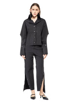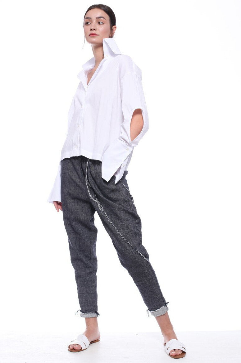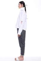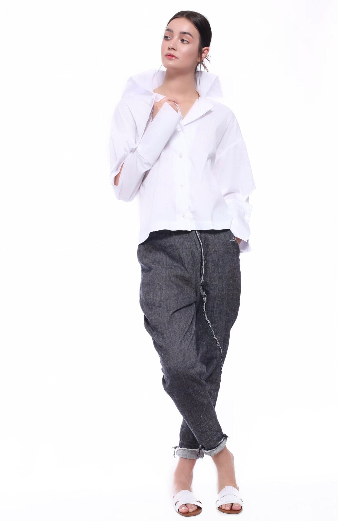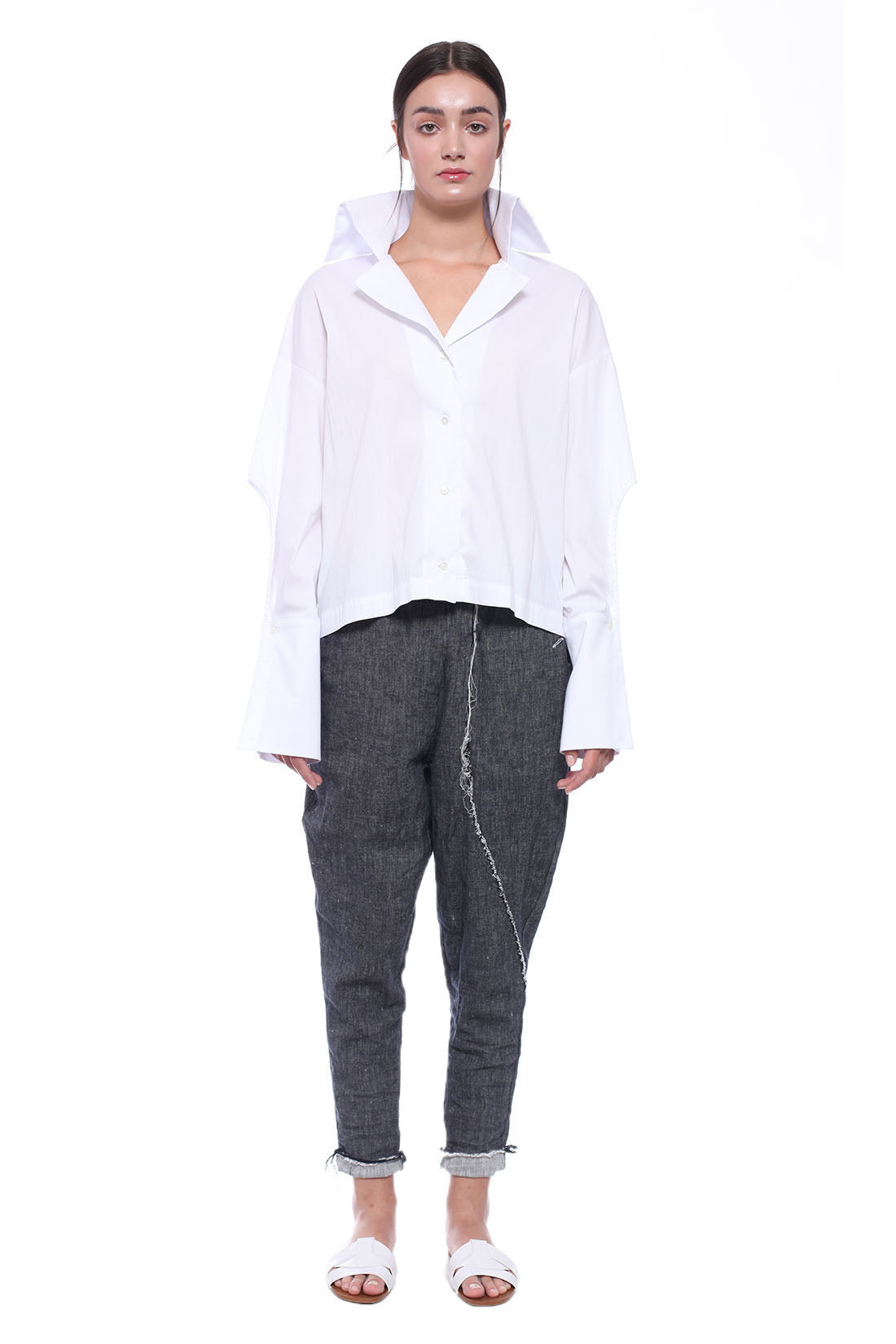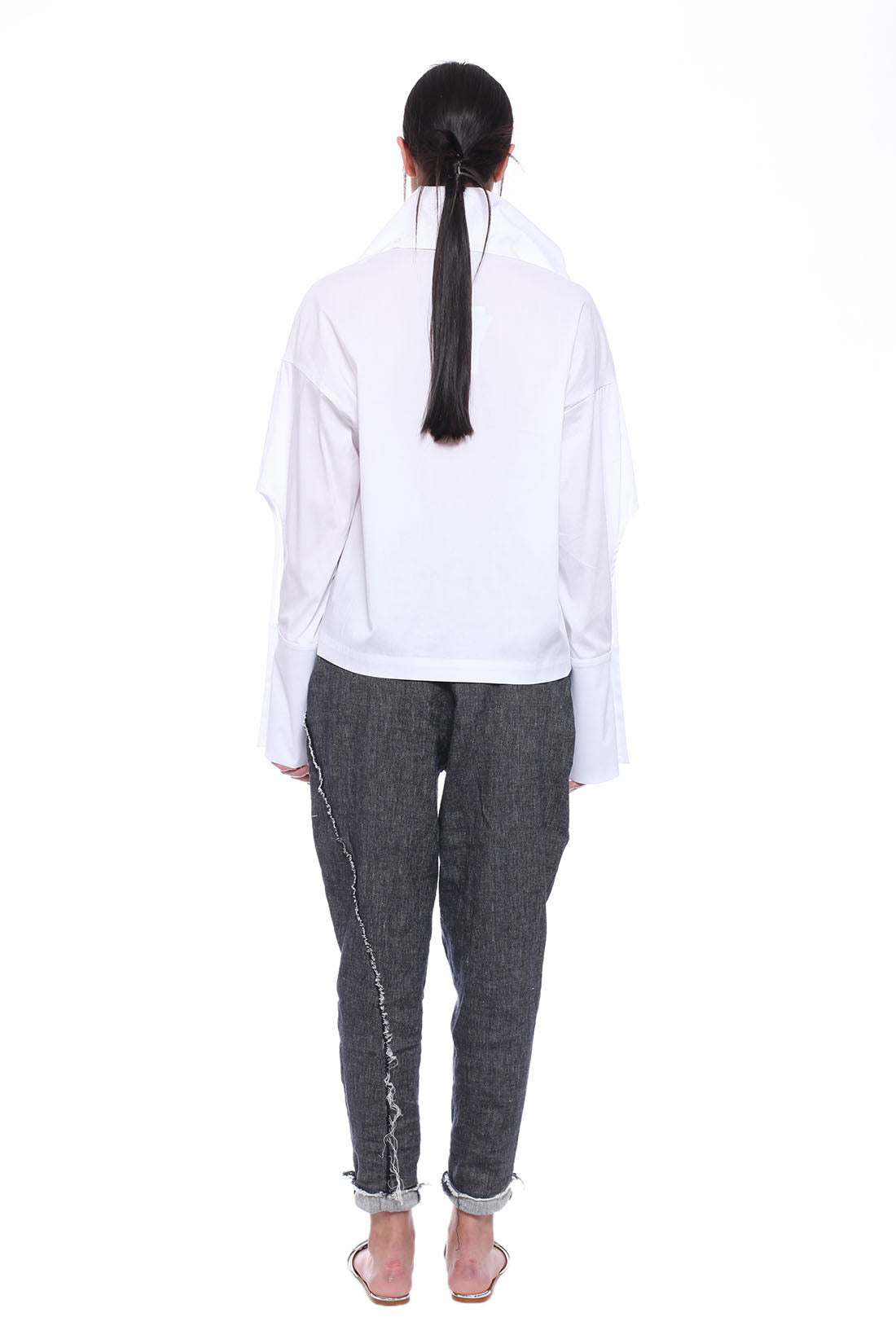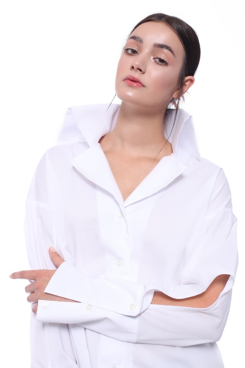 STRETCH COTTON POPLIN SHIRT WITH A HIGH AND DOUBLE COLLAR, WIDE OPENING SLEEVES WITH GIANT CUFFS. MOTHER-OF-PEARL BUTTONS.