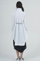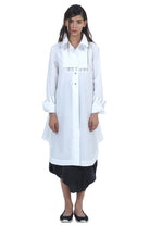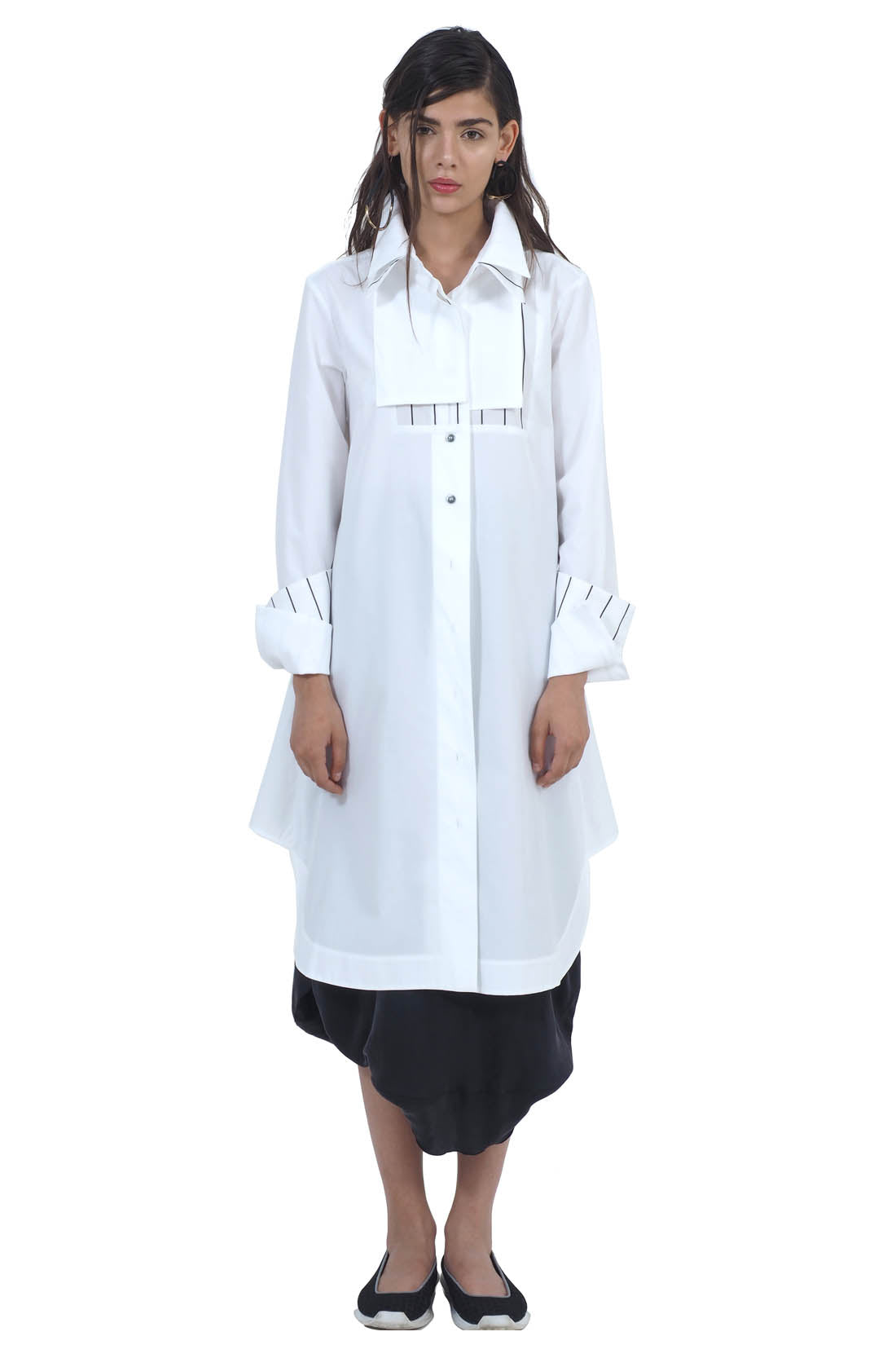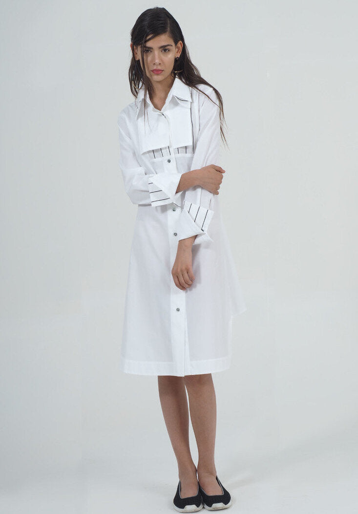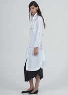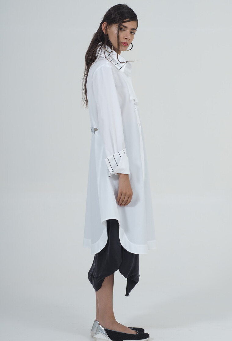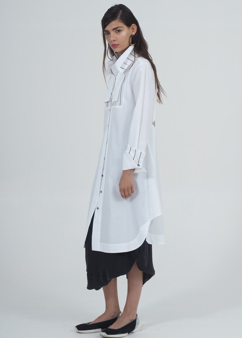 Long sleeved shirt-dress with asymmetrical cuffs, front panel detail with insert, double collar and elastic clip accessory.