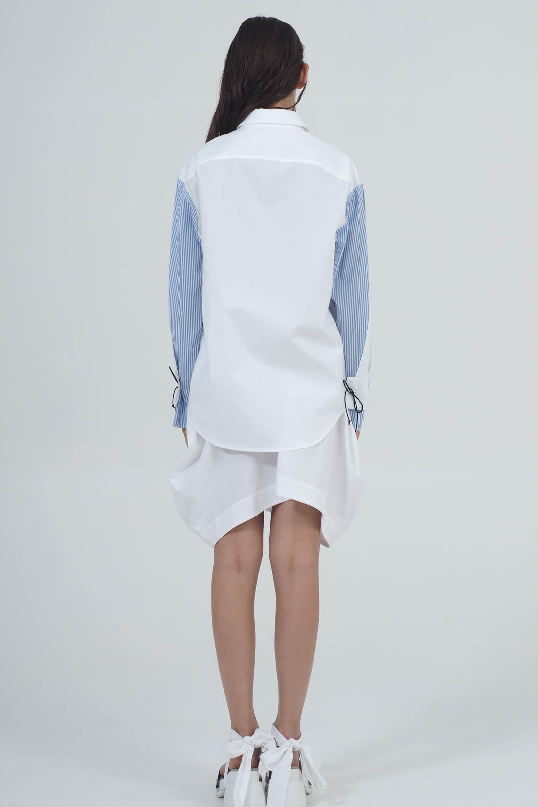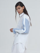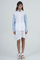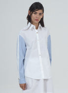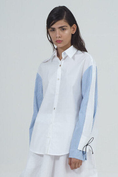 MEN-CUT SHIRT WITH LOW SHOULDERS AND LONG SLEEVES IN CONTRASTING FABRICS. MOTHER-OF-PEARL BUTTONS.