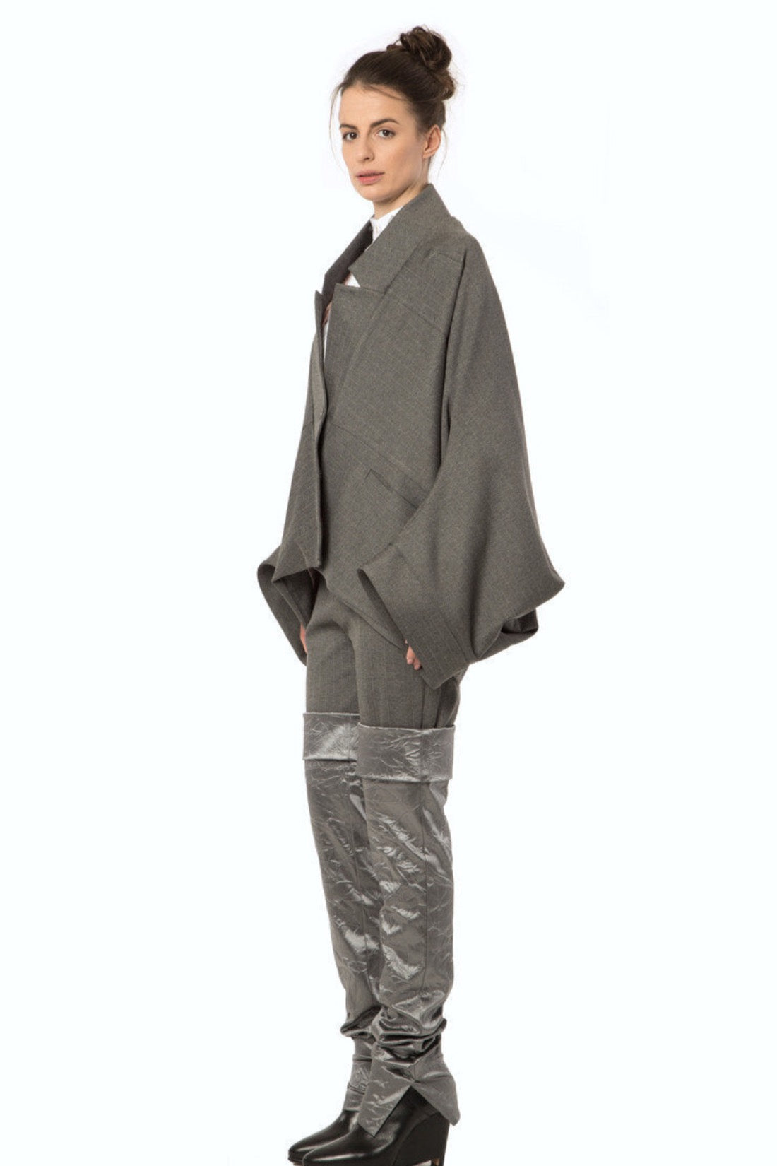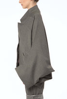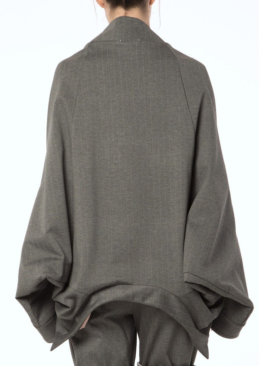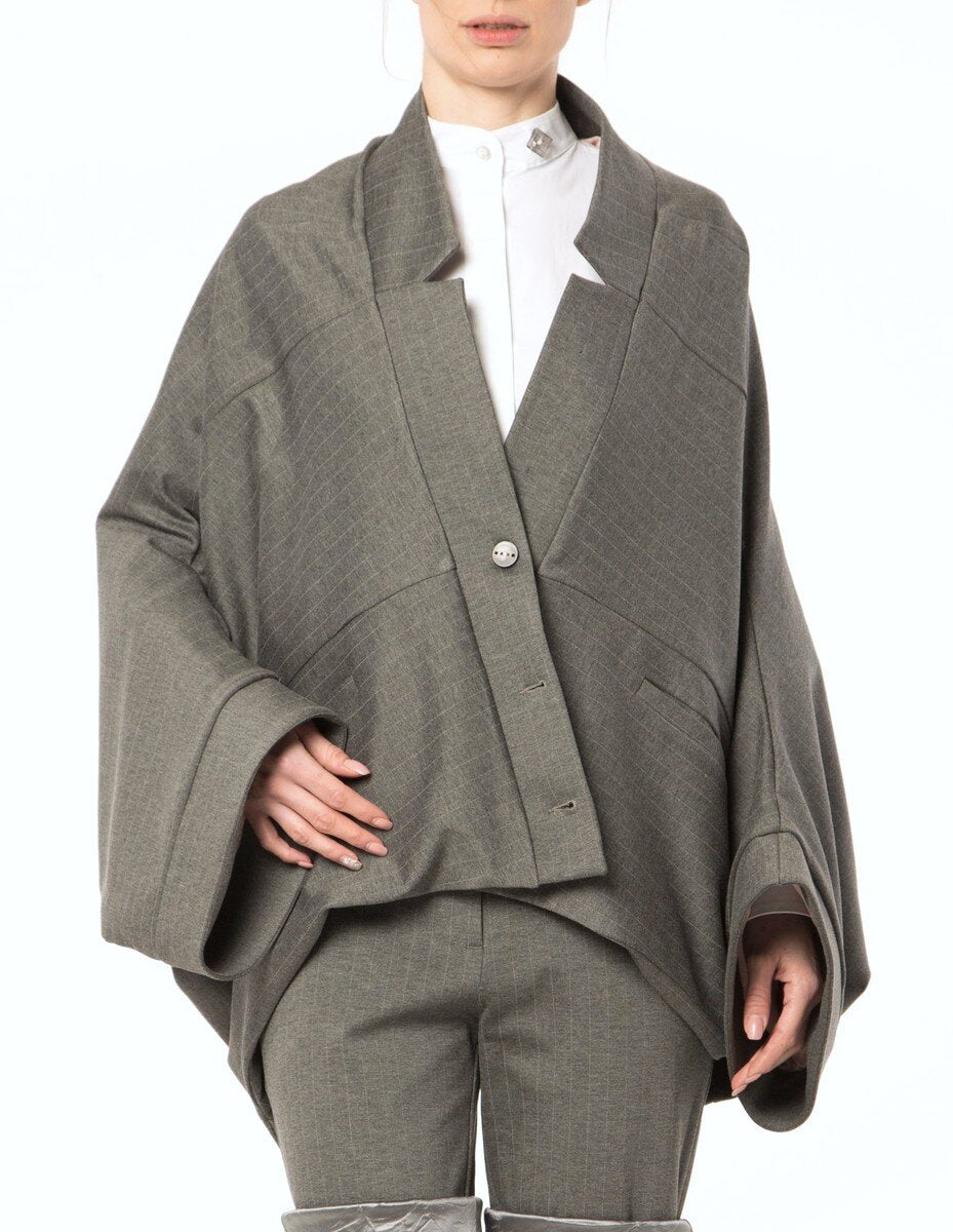 Irregular Kimono cut jacket with lining, can be worn upside down. Front buttoning.