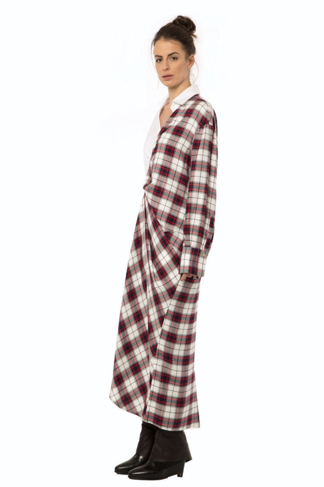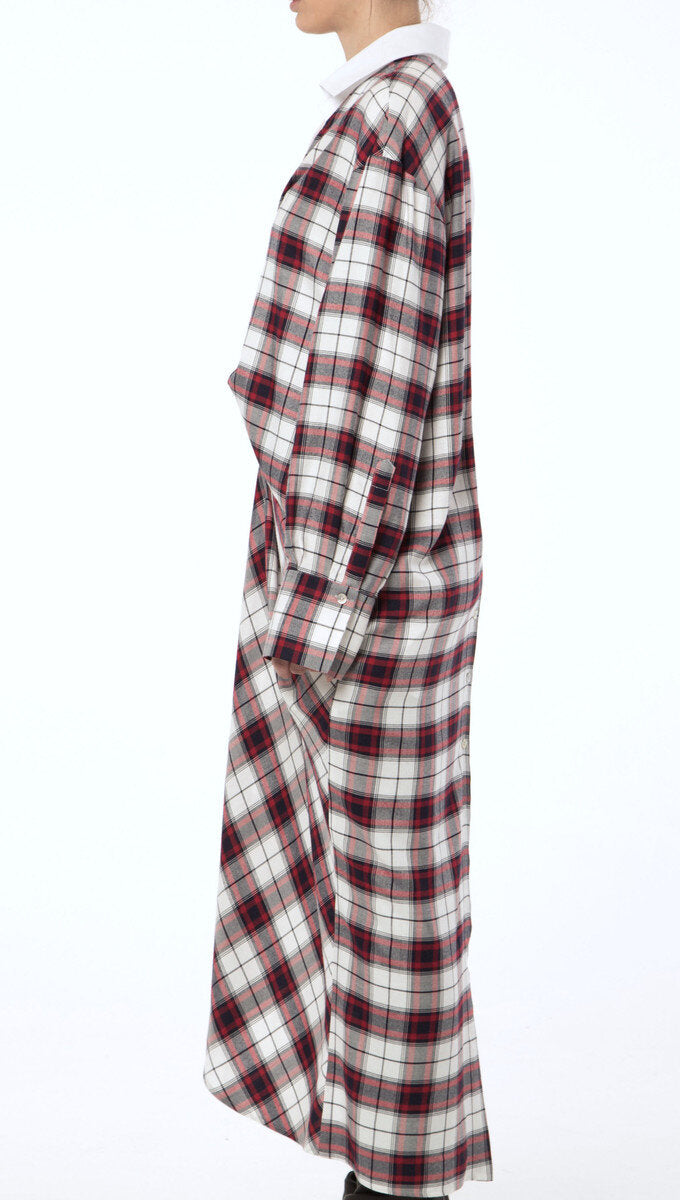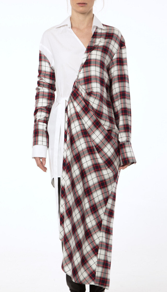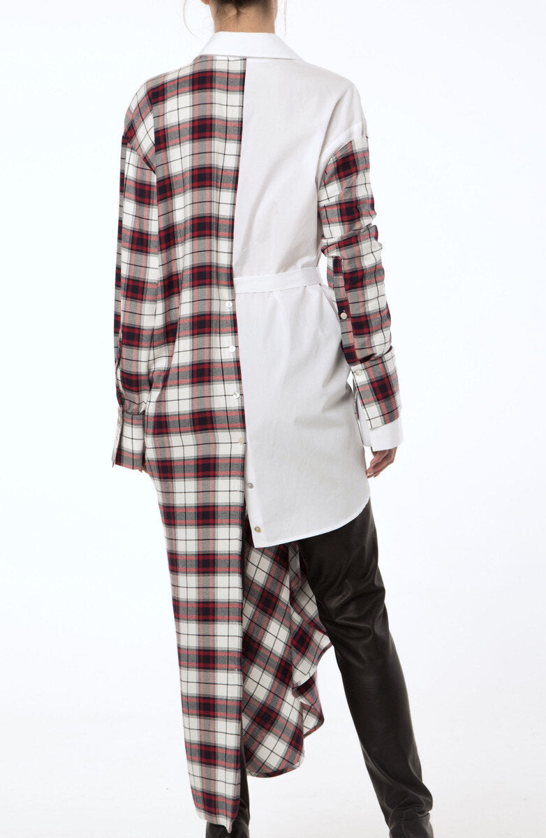 Long shirt composed of two contrasting fabrics on the right and left sides, with differing lengths between the right and left. The sleeves also feature contrasting fabrics on opposite sides. It has a V-neck collar and is fastened with an inner tie and a  belt at the front.